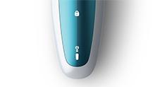 Indicatore livello batteria a 1 livelloIl display ha un indicatore del livello batteria, un indicatore per quando è necessario pulire il rasoio, un indicatore di batteria scarica, una spia di sostituzione delle testine e una che indica se è attivato il blocco da viaggio. |